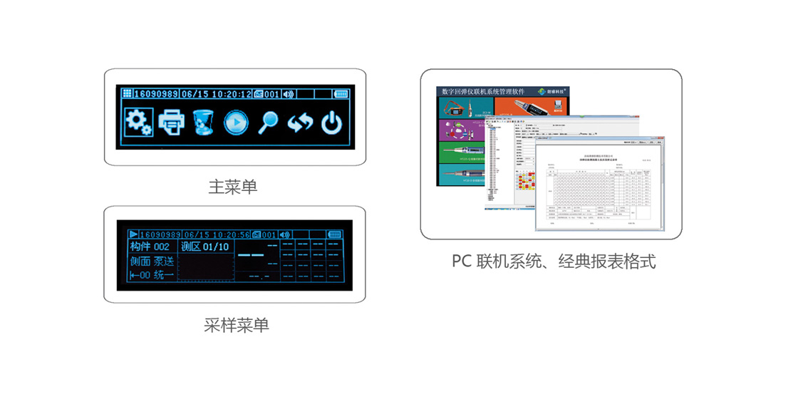 回弹采样、结果查看、蓝牙打印、后台设置、联机上传等功能